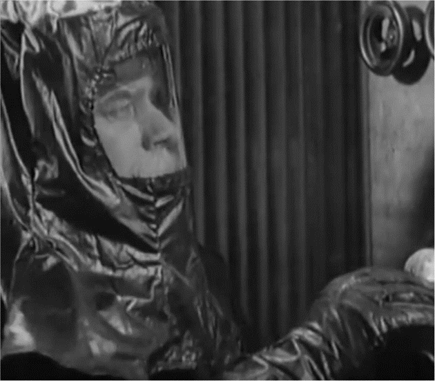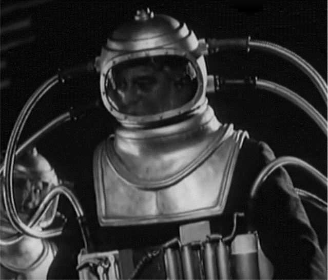Приблизившись к Луне, экипаж разворачивает ракету и осуществляет драматическую жёсткую посадку, используя основной двигатель в качестве тормозного. Ракета глубоко зарывается в лунную пыль. Среди членов экспедиции критические непонятки о дальнейших действиях. В ходе попыток решить ее выяснилось закончился кислород, и на всех не хватит, для благополучного возвращения домой. В этом неплохом фильме все дико уныло в плане костюмов. Никаких изощрённых дизайнерских решений или ошалелой выдумки. Все костюмы характерны для той эпохи когда снимался фильм. Её носили в повседневной жизни в ней же и полетели. Здесь мы даже не увидим полюбившейся нам с предыдущего обзора кожаной или целлофановой одежды. Похоже немцы черную кожу и латекс оценят чуть позже. Со скафандром, похоже съемочная группа, вообще не заморачивалась, а просто отобрала у проходившего мимо водолаза. Хотя по тому виду как персонаж одетый в этот костюм вываливается с удивленным видом из люка, можно подумать, что и водолаза прихватили в фильм. Он просто не сразу разобрал что находится не на дне морском а на Луне. Подводя итог этому обзору можно смело поставить двоечку художникам фильма «Женщина на Луне»