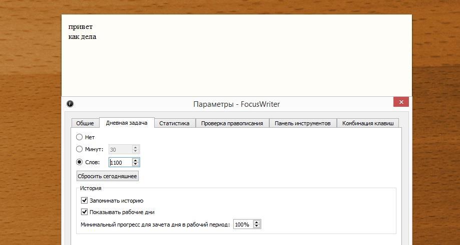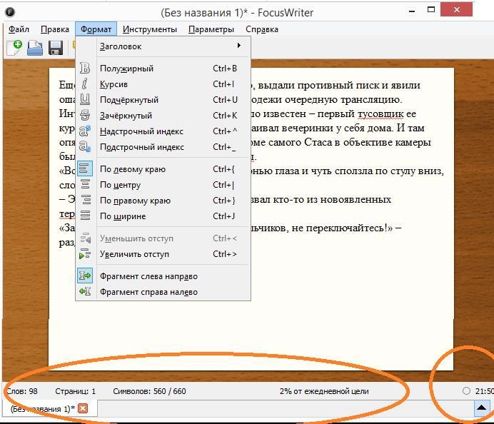 1) Подсчеты в текстовом редакторе FocusWriter - это (бесплатный) текстовый редактор, мечта минималиста, аналог ворда, но только выкинули много лишнего. Зато добавили такие полезные штуки для пишущих людей, как - норма писания (либо во времени, либо в количестве знаков) - причем прогресс выполнения нормы отображается внизу экрана (надо навести мышку вниз, по умолчанию в окне программы кроме "листа бумаги" ничего! - см.картинку ниже. минималисты рады