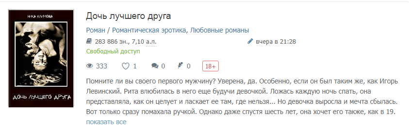 Автор: Ника КлимоваНесмотря на всего лишь +13 в квартире и -40 за окном, книга продолжает писаться и регулярно выкладываться. Уже готовы 8 глав, или чуть больше 7 алок, "Дочери лучшего друга". Наверное, это только середина. Впереди еще много событий в жизни главных героев. Не все будут приятными. Будет ли ХЭ, пока не знаю. Пыталась писать строго по плану, не получается. Я сразу теряю к истории интерес. Поэтому куда выведут диалоги и поступки героев, не имею ни малейшего понятия. В голове есть только контрольные точки поворотных событий. А что между ними? Все на совести персонажей.