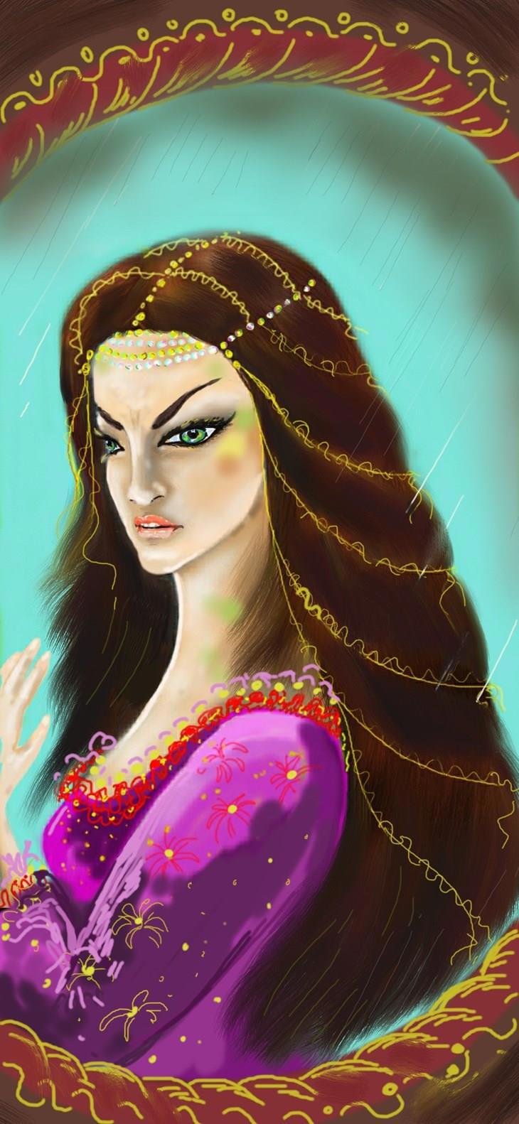 Черноволосая молодая женщина в богатом платье, расшитом золотом и камнями, смотрела куда-то в сторону. По бледной коже плясали разноцветные ответы. Черты лица были тонкие и изящные, но сведенные к переносице брови и поджатые губы выдавали гнев и не слишком добрый нрав.