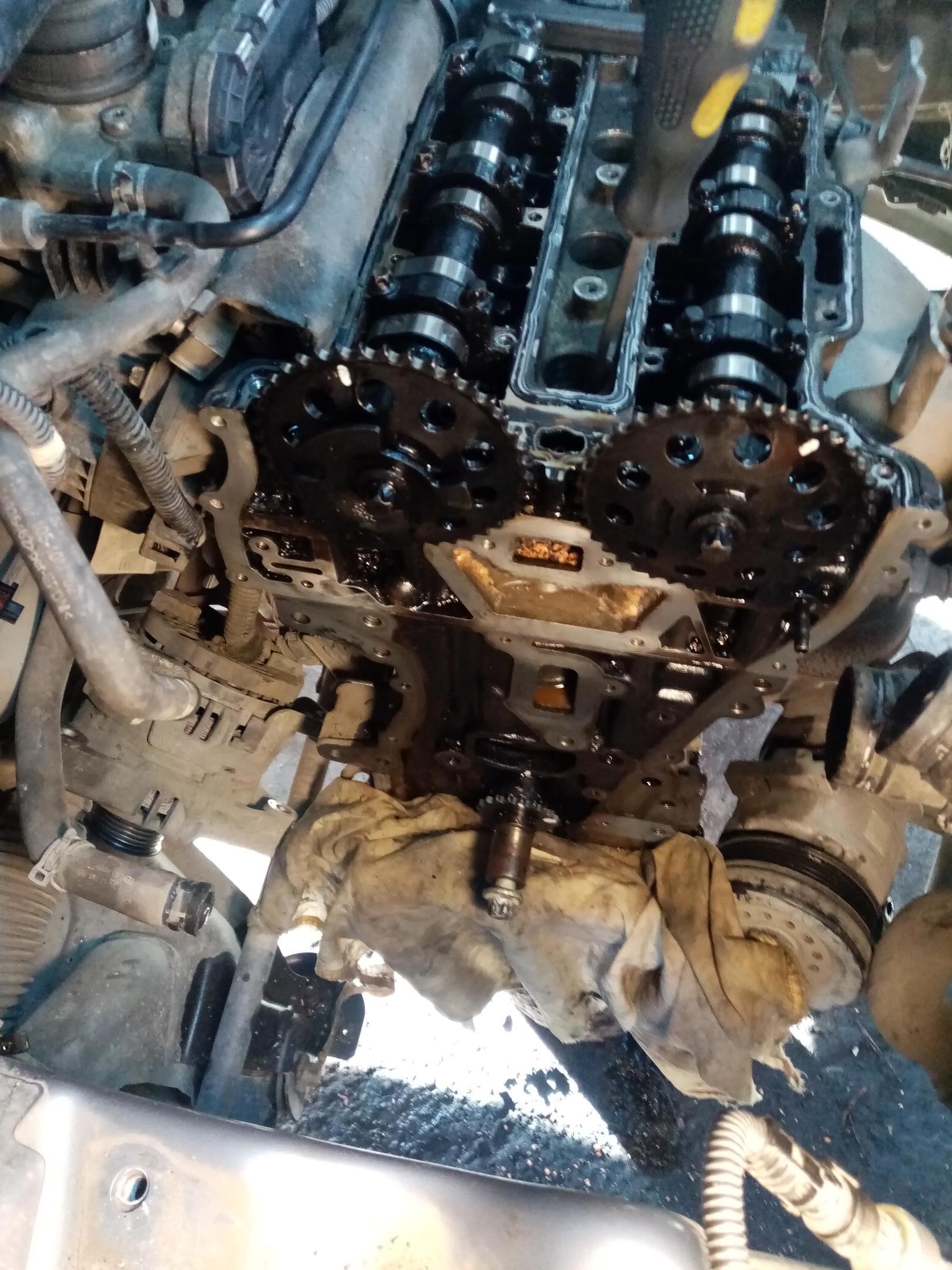 И вот такой мотор на этом несчастном опеле. Но, у него звезда коленвала сидит на форменной проточке, тоесть можно заменить грм без специнструмента. С шестернями распредвалов сложнее, они безшпоночные, и есть там ещё одна подстава - реперный диск датчика положения распредвала, который отвечает в частности за зажигание. Перед снятием цепи лучше нанести метки на цепь и шестерни на распредвалах, и на колене, перед этим надо выставить мотор в вмт по метке на шкиве коленвала и крышке грм, и у нас был стопор для распредвалов, который можно сделать из сорокпятого уголка, как говорят в интернете. Вообще было подозрение, что убежали метки. Я всё выставлял раза 3, и убедился что всё соответствует. Колено по метке, прорези на валах встают параллельно плоскости разъёма гбц и крышки гбц. Чтоб убедиться что поршень первого цилиндра ТОЧНО в вмт, щупал его длинной отверткой через свечной колодец. Мои наблюдения совпали с метками. А все эти пляски с бубном потому, что подходящего стопора для коленвала у нас небыло. Их вообще полно разных, почти для каждого мотора - свой.