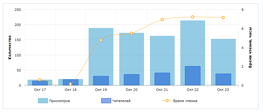 Ответы на задания читатели искали в самих книгах, что не могло не отразиться на часах чтения и прочих показателях. По диаграмме ниже легко определить в какой день начался квест. (Выкладка книги была завершена за пару месяцев до того).