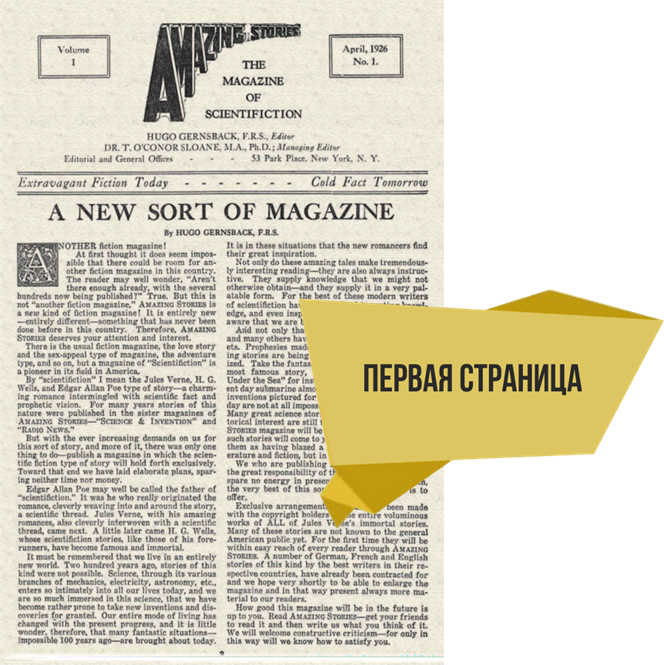 Так начинается первый номер нового научно-фантастического журнала «Amazing Stories». Журнал начал свои историю в апреле 1926 года. Журнал выходил на хорошей бумаге в формате bedsheet, характерном не для дешёвых бульварных журналов, а престижных и более дорогих изданий в глянцевых обложках — таким образом Гернсбек позиционировал «Amazing» не просто как развлекательное издание, а как познавательное и научно-популярное.
