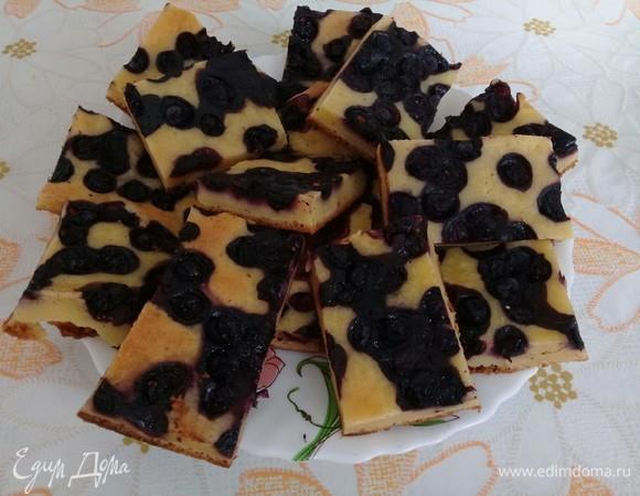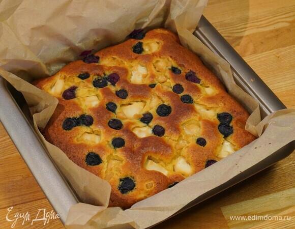 Займемся готовкой. Духовку предварительно разогреваем до 180°C. Взбиваем 4 яйца с 4 столовыми ложками меда. Добавляем маленькую баночку нежирной 10% сметаны. Затем аккуратно порциями вмешиваем стакан просеянной муки. Добавляем полстакана свежей или замороженной голубики. Выкладываем бисквитное тесто с голубикой на смазанный растительным маслом противень. Выпекаем пирог в духовке 40 минут. Рецепт с сайта "Едим Дома".