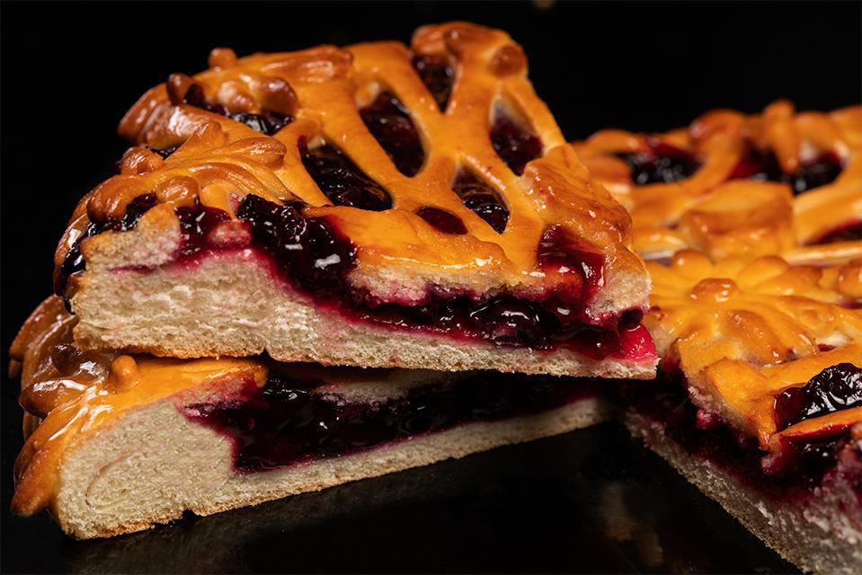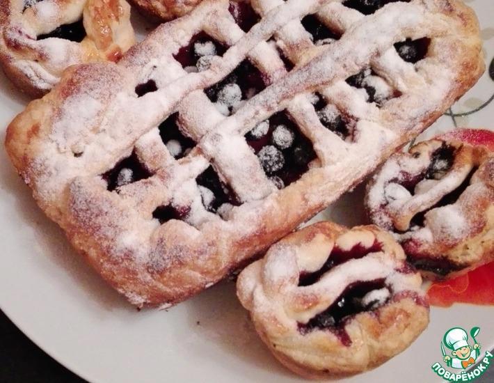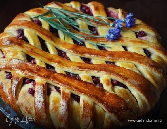 Для теста Для начинки Займемся готовкой. Возьмем кефир комнатной температуры, растворим в нем дрожжи, добавим соль, сахар и немного муки, накроем полотенцем. Через полчаса добавим к смеси яйца, подсолнечное масло, ванильный сахар и еще немного муки, опять закроем полотенцем. Еще через 30 минут добавляем оставшуюся муку и замешиваем тесто, которое оставляем еще примерно на 40 минут. Затем тесто делим на две неравные части. Большую часть раскатываем, укладываем сверху ягоды, пересыпанные крахмалом и сахаром. Раскатываем меньшую часть, режем на полоски и выкладываем их поверх начинки. Смазываем верх желтком. Выпекаем около 30 минут при 190°C. Рецепт с сайта Едим Дома