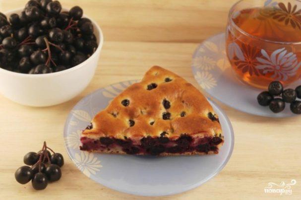 Займемся готовкой. Первым делом подготавливаем все ингредиенты для пирога. Творог кладем в миску, добавляем к нему сахар. Все тщательно разминаем вилкой. Следующим шагом мы вбиваем яйца, все перемешиваем. Всыпаем заранее просеянную муку и упаковку разрыхлителя. Все тщательно перемешиваем. Ягоды черноплодной рябины промываем. Отправляем их в миску с тестом. Перемешиваем аккуратно, чтобы не раздавить ягоды, и отправляем тесто в смазанную форму для выпечки. Ставим пирог в разогретый до 180°C духовой шкаф на полчаса. Готовый пирог вынимаем из духовки и оставляем в форме на один час, после чего достаем его из формы, нарезаем и подаем к столу. Рецепт с сайта povar.ru.