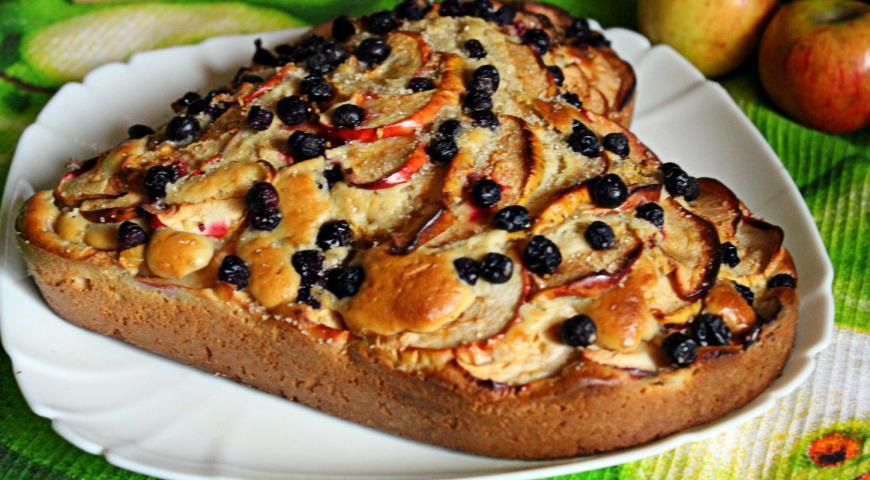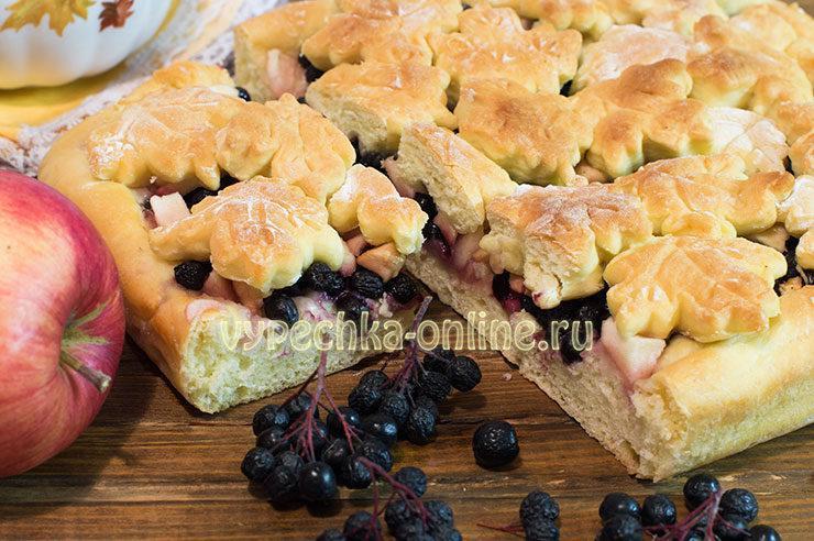 Для теста Для начинки Займемся готовкой. В глубокую и широкую посуду просеиваем 500 гр. муки, сюда же засыпаем сухие дрожжи и тщательно перемешиваем. Соединяем вместе яйца, сахар, соль, воду и растопленное сливочное масло и взбиваем венчиком. Общая температура смеси должна быть около 35-40 градусов — это лучшие условия для работы дрожжей. Вливаем яично-масляную массу к муке, в процессе вымешивания добавляем ещё 60 гр. муки. Накрываем шар теста и ставим его в тёплое место. После того как тесто на пирог поднимется, аккуратно обминаем тесто и возвращаем в тепло, чтобы дать ему ещё раз подняться. Тесто разделим на две неравные части — примерно треть для верха и две трети для основы. Большую часть теста раскатаем по размеру формы или противня, смажем тонким слоем масла и перенем в форму. Для начинки соединим вместе черноплодку, нарезанное кубиком яблоко и сахар, перемешаем и выложим на тесто, равномерно распределяя по поверхности. Меньшую часть теста раскатаем в пласт. Можно просто им накрыть начинку, сделав защипы по периметру - и выпечь закрытый пирог. Можно вырезать формочкой для печенья много листьев, при этом форму для печенья предварительно опускаем в муку, чтобы удобнее было работать. Листики укладывам на начинку в произвольном порядке. Верх пирога можно смазать кисточкой взбитым яйцом или желтком, смешанным с 1/2 ч.ложки молока или воды. Украшенный пирог ставим в духовку на 25-30 минут при температуре 180°C. Важно не пересушить при выпечке тесто. Пирог вынимаем из духовки, накрываем фольгой, сверху полотенцем и даем немного остыть. Можем смазать поверхность кусочком сливочного масла, можем сразу выложить пирог на решётку, чтобы низ не отсырел. Перед подачей нарезаем порционно. Рецепт с сайта vypechka-online.ru.