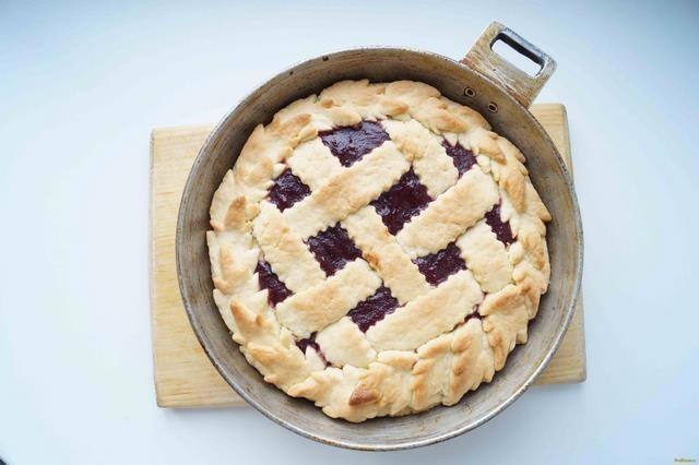 Займемся готовкой. Муку смешать с сахаром. Добавить нарезанное кубиками очень холодное сливочное масло и порубить его с мукой до образования крупных крошек. Добавить холодную воду, замесить тесто, скатать его в шар, обернуть пищевой пленкой и на 20 минут отправить в холод. Из части теста раскатать очень тонкий пласт (не больше 1,5 мм.), перенести и уложить его в форму для выпекания, формируя бортики (края должны свисать), и прижимая тесто у основания бортиков. Выложить варенье в основу. Раскатать еще один кусочек теста в тонкий пласт, вырезать круг по размеру верхнего диаметра формы, накрыть им начинку и слепить края с тестом на бортиках. Лишнее тесто удалить. Выпекаем 30 минут в разогретой до 180°C духовке. При подаче можем украсить ягодами и шариком мороженого. Фото с просторов интернета.