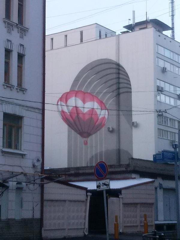 Так и у нас, отдельно будут кадры, и отдельно про публику. Начнём с кадров. Так сказать, Москва город контрастов. Это в Хамовниках, блатной район так сказать. Сделано всё с одной точки, только объективом крутил по сторонам. И в одной стороне вот эта роспись во всю стену - аэростат-монгольфьер выплывает из-под арки.