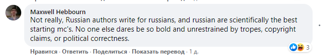 Мистер Максвел Хебборн возражает, что русские пишут для русских, а с научной точки зрения русские – это лучший стартовый персонаж, так как не ограничен тропами, авторскими правами и политкорректность. True, bro.