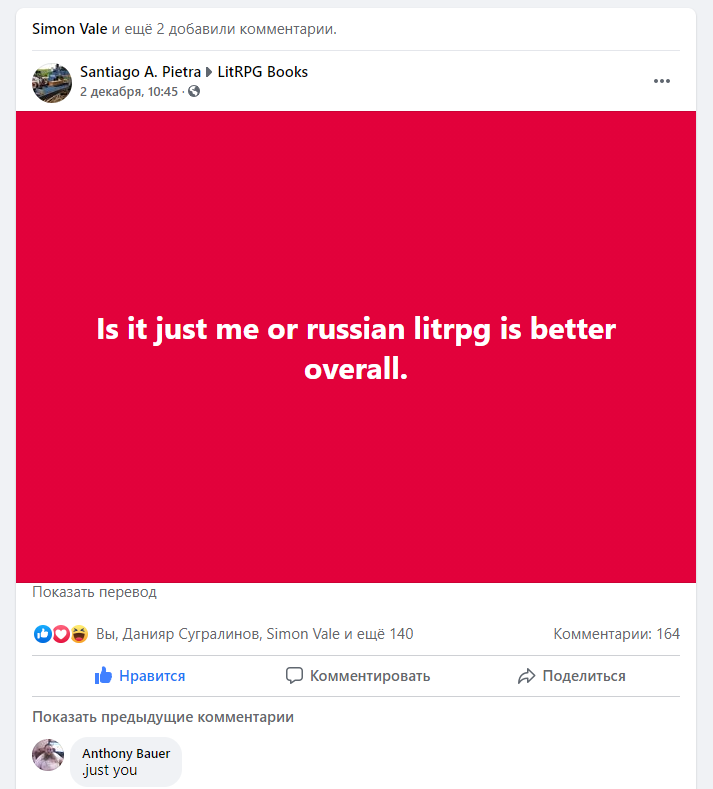 Автор: Максим ЛагноНе пугайтесь нерусских букв, это просто вопрос из дискуссии в ФБ-группе LitRPG Books о русском литрпг. Смысл такой: мне кажется или в целом русское литрпг получше?