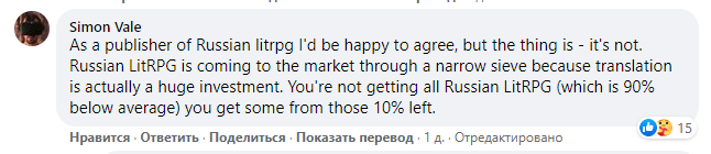Как издатель русского LitRPG я бы с радостью согласился, но дело в том, что это не так. Русский LitRPG выходит на рынок через узкое сито, потому что перевод - огромная инвестиция. Вы получаете не весь русский LitRPG (что на 90% ниже среднего), а часть из тех 10%, которые остались.