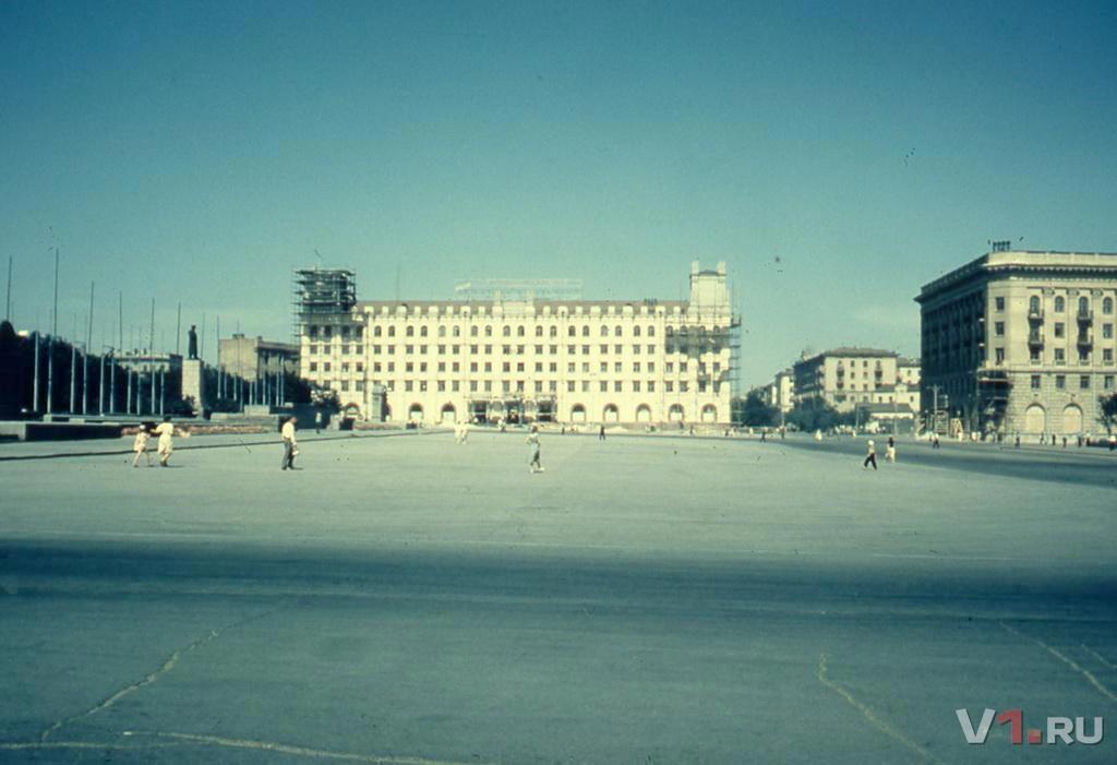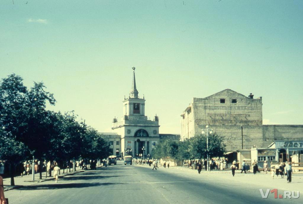 Обратите внимание на то, что расположено оно строго перпендикулярно, уже пять лет как открытой, улице Мира, которая уходит вдаль. Связано это с тем, что справа налево так же перпендикулярно идут вновь созданная Аллея Героев и восстановленная Площадь Павших Борцов. Выглядит всё замечательно. Обращаемся к фотографии 1962 года, сделанной по всей видимости из окна гостиницы "Волгоград", сверху и видим всю дисгармонию нового здания с идущей от Вокзала наискось улицей Гоголя - это хорошо заметно на достаточно высоком здании, в котором тогда располагалась Междугородная Телефонная Станция, до этого - завод "Красная Застава", а ещё раньше - гвоздильный завод братьев Серебряковых: