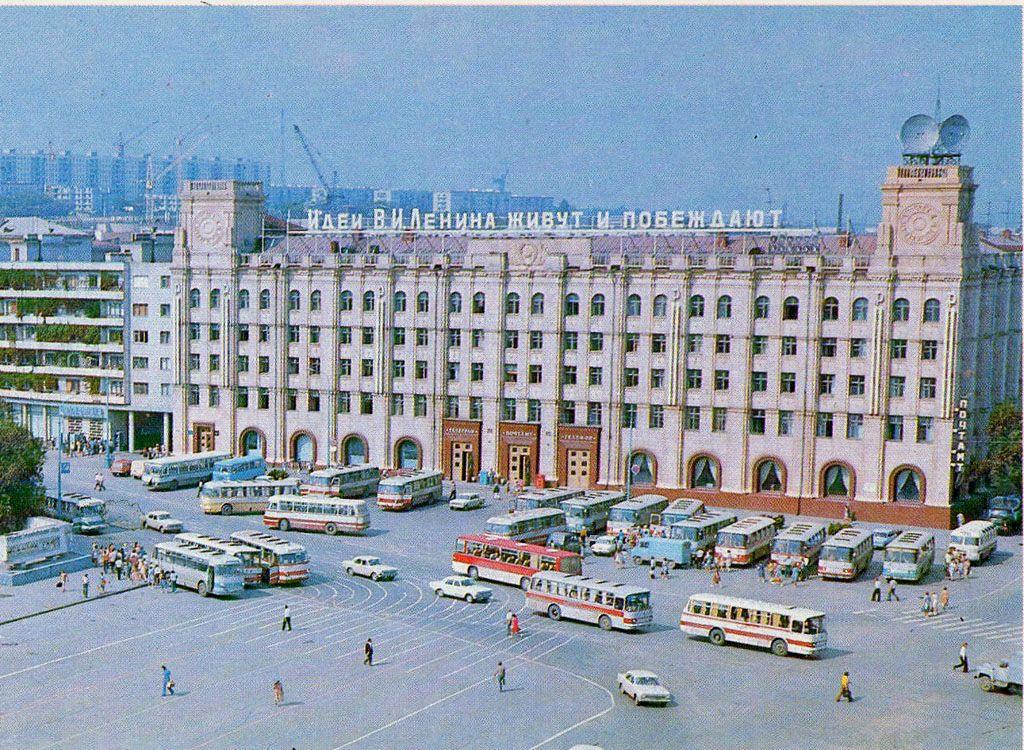 Решение было найдено далеко не сразу, но (с моей точки зрения) оно оказалось блестящим - вид 1969 года с тыльной "затрибунной" части Площади Павших Борцов, на которой позже будет разбит сквер, а пока пустырь и даже ещё пока стоит "Флигель" - остаток довоенных зданий: