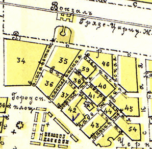 Угол достаточно заметен. Почему улица Гоголя идёт так косо? Дело в том, что в этой части Города возле Вокзала все улицы были такими вплоть до самой Сталинградской Битвы и изначально носили названия женских имён - фрагмент карты Царицына, на котором улица Гоголя ещё называется Елизаветинской - была переименована в 1909 году к столетию со дня рождения писателя: