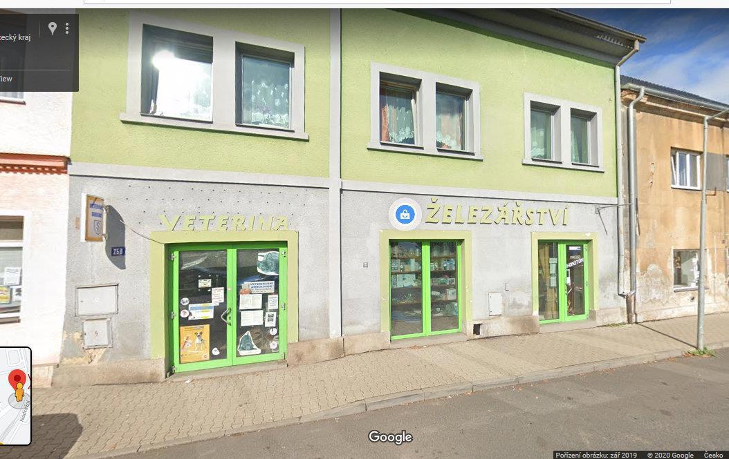 Вот фотка с гуглмапс (Podbořany, Vroutecka 258). Слева «ветерина» — моё, справа «железарстви» — всякое из металля для хозяйства. Над нами три съемные квартиры, вход в которые со двора и задней улицы.