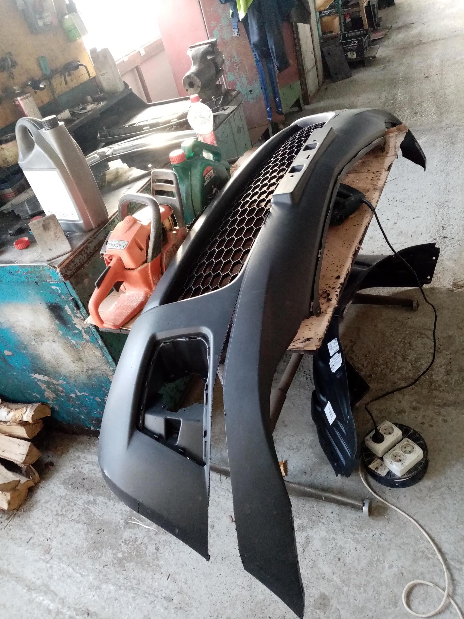 Толстое, вобщем. Владелец хотел поменять передний бампер. До этого приехал на патриоте, спрашивает директора: сколько будет стоить заменить передний бампер, ну директор и сказал - два рубля. Что там делов-то, снял поставил. Когда приехало ВОТ ЭТО, директор (и я, мнеж делать, а ему мне помогать) приуныл. Бампер составной, снизу силовая часть, сверху остаток родного пластика, который потрескался. А так как новый владелец броневика в средствах не стеснен, он решил его заменить. Мы с директором сунулись - хрен там просто сделать, много возни (ибо приколхожено), да и цена уже не 2 рубля будет (о том что заказчик желает платить мы ещё не знали), вобщем отказалися директор по телефону. Когда клиент приехал, говорит а что вы не беретесь-то, я ему ответил что дело будет не простое, не быстрое, да и цена выйдет дороже чем озвучено. Он мне "я не тороплю, и дороже - так и дороже. Сколько? 20?". Я от такой цифры опешил, честно говоря. Предложил клиенту ещё раз поговорить с директором, который был на обеде, клиент сказал что съездить к ещё одним кузовщикам местным, и если там откажут - приедет к нам. Уехал, я директору всё пересказал, он спросил "будешь делать?", я ответил что "буду", раз клиент не против применения грубой силы (болгарки), и по времени не торопит. Через час клиент вернулся. В той мастерской его нахрен послали, хоть и вежливо. Рассказал что где только небыл: одни постоянно уставшие, другие выпившие, третьи нахрен послали, и только мы не отказали, а потом вообще сказали что сделаем. Ещё требовалось заменить подкрылок, и найти что там пищит. Пищало кстати збс. Не пищал гудок, это тоже требовалось прояснить. Начали с бампера. Были сложности с доступом, потомучто стояли фендера на арках, и нихрена там ничего не откручивалось. Но добрались, старый криво отпиленный кусок бампера сняли, сделал замеры, разметил, отпилил, подогнал. Получилось вот такое безобразие.