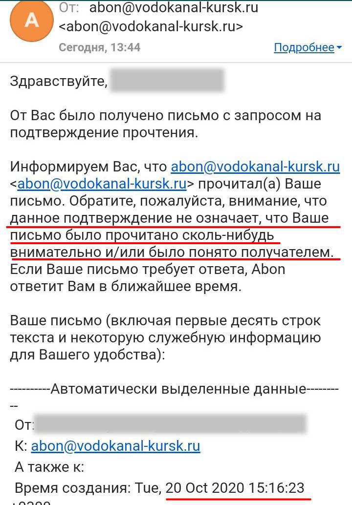 Автор: Татьяна БуглакПолтора месяца назад я отправила в городской Водоканал заявление об изменении состава семьи, приложив документы с печатями о смерти папы. Сегодня, не прошло и двух месяцев, мне приходит подтверждение, что письмо получено. Очень оперативно, ага.