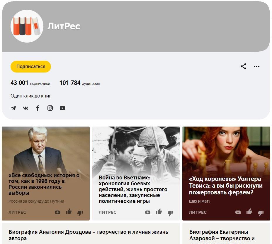 4) А еще статейки /тексты - Яндекс-Дзен (вы посмотрите на кол-во подписчиков и аудиторию! И вы всё еще удивляетесь, что народ, захоти почитать что-нибудь, за первым делом попадет на Литрес или Литнет?!