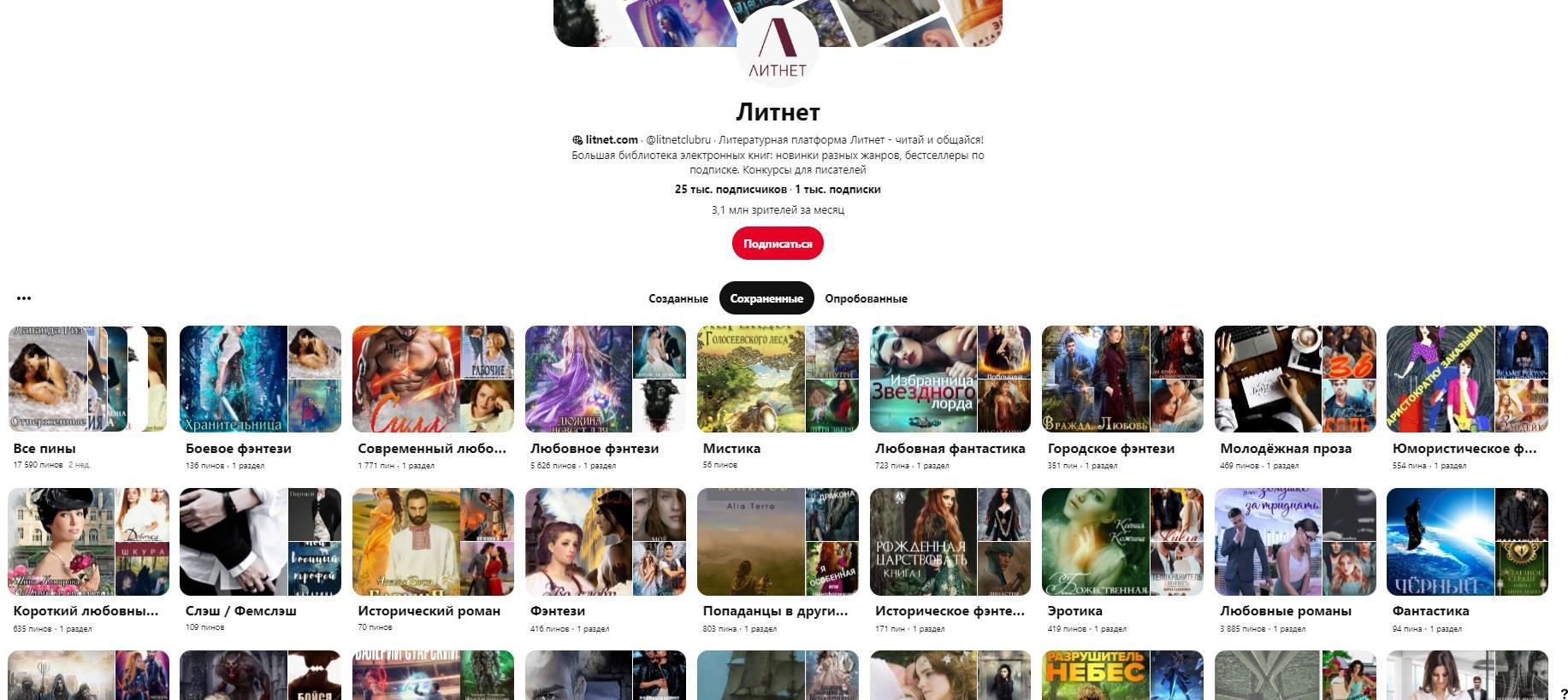 То есть туда авторам даже проситься не надо, сайты видимо автоматом выносят все обложки с активными ссылками на каждую! книжку. как я уже где-то упоминала, неожиданно нашла от имени литнета на пинтересте выставленную мою бесплатную книжку (вернее даже рассказ). То есть я и знать не знаю, а ссылки на мои "шЫдевры" раскиданы ручками того сайта (на свою платформу, конечно). Да, только обложки, да, минимум текста, не очень завлекательного, но активная ссылка и, вообще, упоминание есть