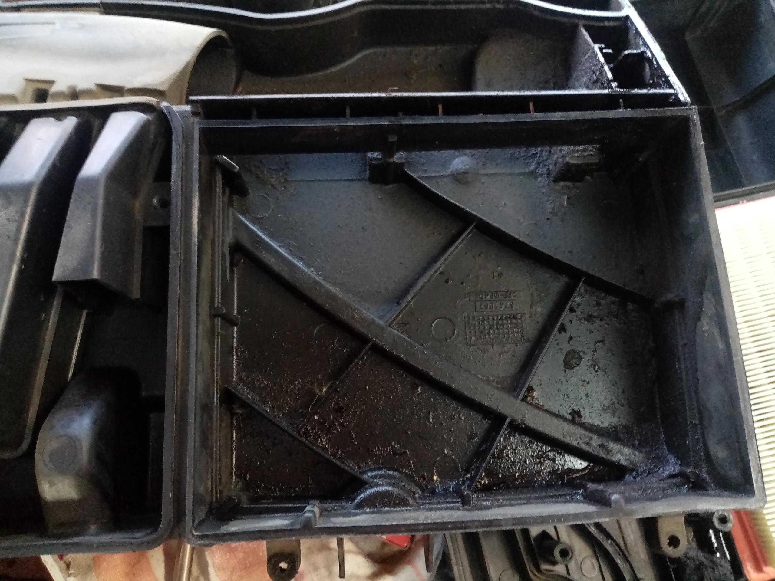 А вот эта коробушка сверху мотора - это корпус фильтра. Там ещё хомута справа небло на патрубке идущем к дросселю. Потому что нафиг он нужен, как считали в форде. Ещё над генератором одного болта нет - лишний. Снимаю корпус фильтра, думаю дай загляну что там внутри. А внутри там грязь! И новый фильтра. И резьбы в пластике нет и половина шурупов для красоты. Закрутил саморезы по дереву - это варварство, но других вариантов не было.