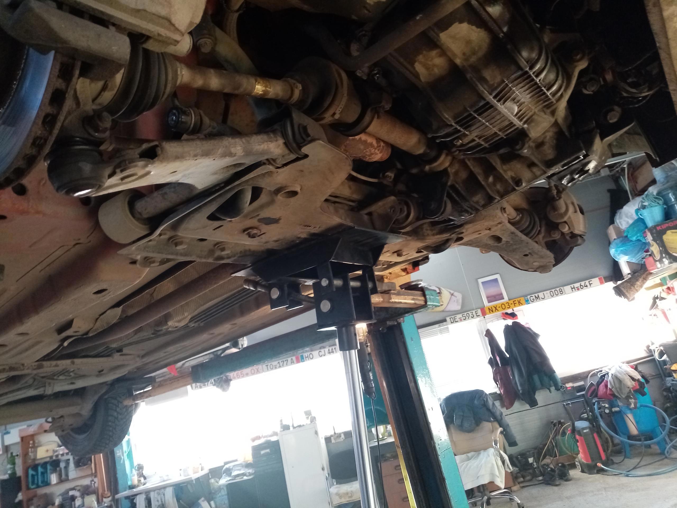 Пока вывешивал, кое-как открутил его болты. Даже с метровым перекладным не получалось! Потому что заржавело. А правый передний болт начал выкручиваться и обловился... Вот тут-то я и снял подрамнике. Но не хотелось расцеплять магистраль гидроусилителя, потому что сделано там всё не очень удобно, открутил от подрамника рейку и оставил её на машине.