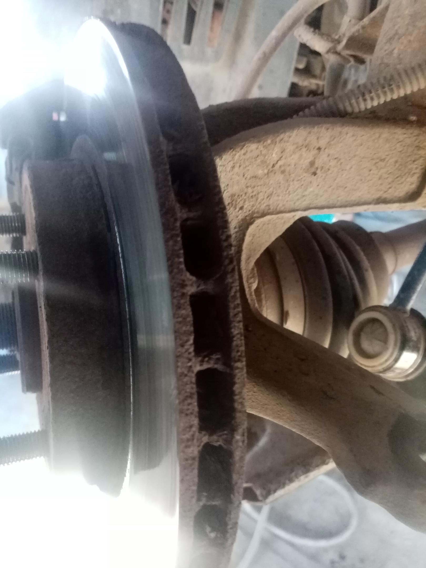 Дальше - больше. Замена датчика давления масла. Фото я не сделал... Датчик находится под впускным коллектором с передней стороны двигателя, над масляным фильтром. Пробую открутить фильтр - хрен там. Беру вороток полметра, и только хорошо на нем повиснув удаётся фильтр открутить. Толи у диллера мастера приколисты, толи сука просто идиоты... Загадка. Но то что масло и фильтра они меняли - это факт. Добираюсь до датчика, выкручиваю старый, закручиваю новый, собираю всё в зад. Поменял передние колодки, попутно обратив внимание что тормозной диск стал тонкий, о чём клиент был уведомлен, но сказал "да и фиг с ним". Ну фиг с ним и фиг с ним. Только тонкий диск хуже отводит тепло. Не говоря уже о том что его легче ведет от нагрева, он может потрескаться, да и вообще нафиг он такой нужен.