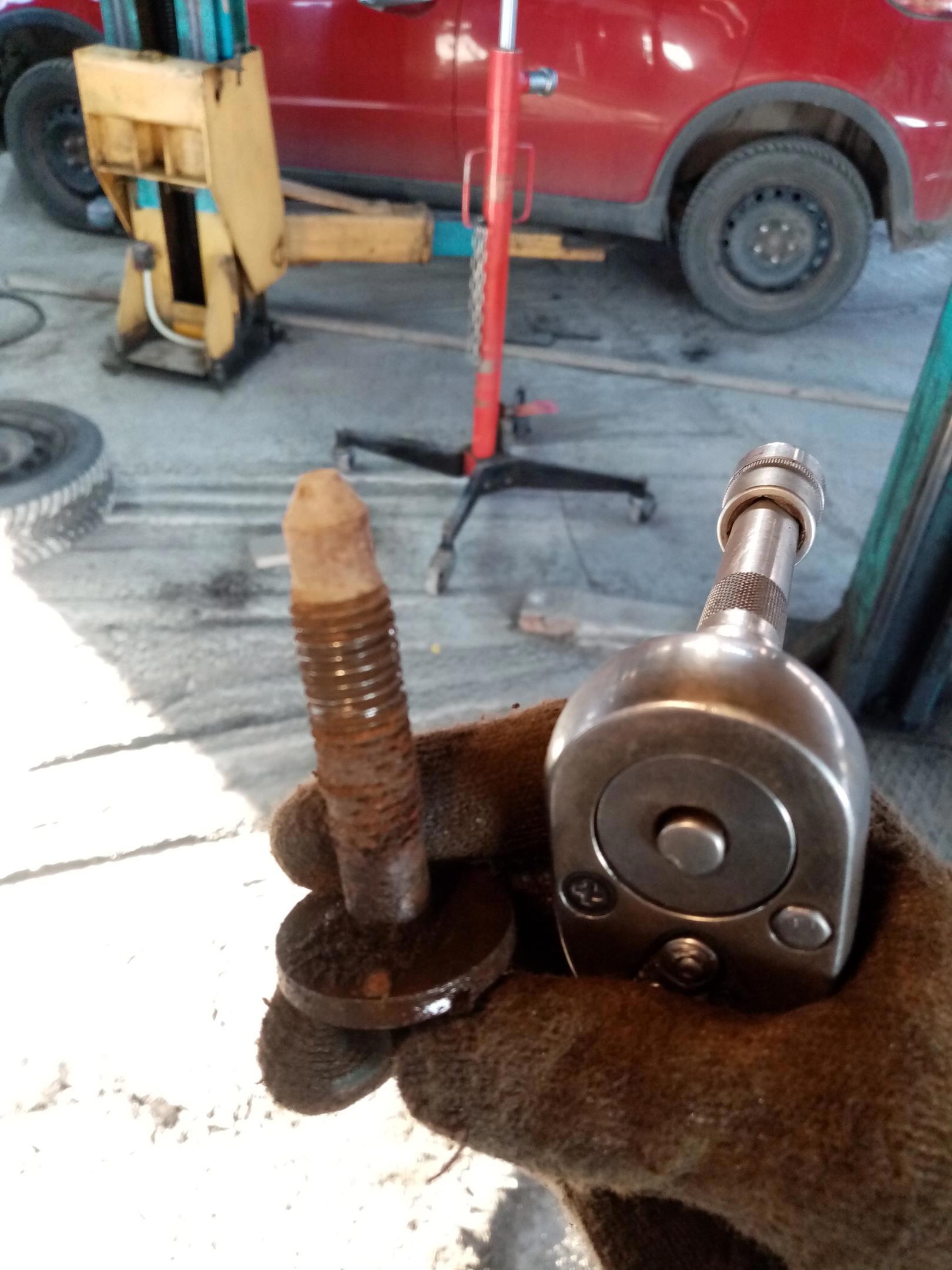 Попутно обнаружил очень хорошо затянутый болт. Он аж в диаметре стал тоньше, потому что вытянулся о того, как его хорошо закручивали. А болт этот держит шаровую нижнего рычага передней подвески в поворотном кулаке, и болт этот хитрый, задняя часть у него 11мм в диаметре, а передняя - 10. И подобрать такой не реально, а если поставить одного диаметра - раздолбит посадочное в кулаке и кулак в помойку. Клиент заказал болты, и мы их заменили позже.