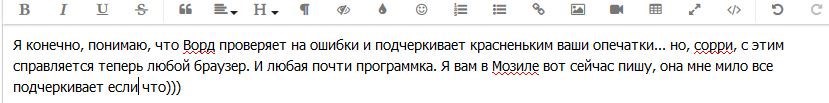 Автор: Анна АлмазнаяЯ конечно, понимаю, что Ворд проверяет на ошибки и подчеркивает красненьким ваши опечатки... но, сорри, с этим справляется теперь любой браузер. И любая почти программка. Я вам в Мозиле вот сейчас пишу, она мне мило все подчеркивает если что)))