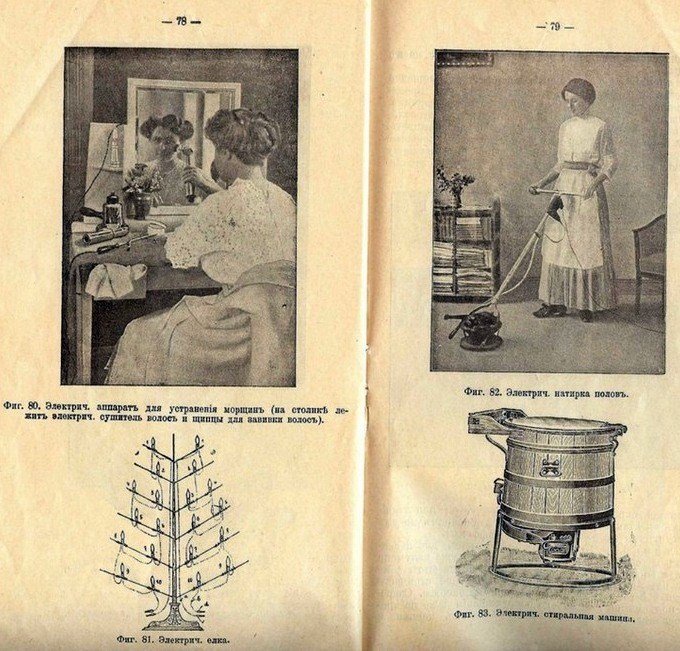 Электрической техники было просто шквал: электросамовары, электроутюги, пассажирские и грузовые электрические лифты. Лампочки угольные и с нитью накаливания от самых тусклых в 12 свечей, до мощных театральных софитов в 3100 свечей (угольные, кстати). Уже была реклама из бегущих огней, ёлочные гирлянды. Для дам делались электрощипцы для завивки волос и фены. Кстати ручной фен был запатентован аж в 1911 году Габриелем Казаряном в США. Паркет натирали электрополотёрами, на кораблях и судах стояли электрические брашпили, насосы, вентиляторы. Снаряды к пушкам тоже подавалось электроподъёмниками. Кстати в России это уже были типовые изделия. Уже плавал по Волге «Вандал» - первый в мире танкер дизельэлекроход. Посмотрите – есть и стиральная машина на основе деревянной кадки.
