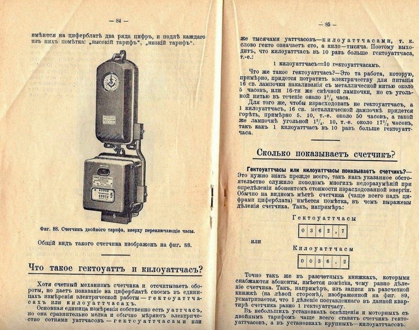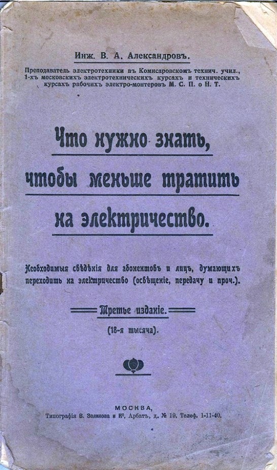 Так как же всё начиналось? Вот нашёл один гражданин дореволюционную книжку. Какого года – не ясно, но – с «ятями» и с военными тарифами, то есть где-то 14-16 год. Полистал её, покачал головой, улыбнулся, отсканировал несколько страниц и выложил в сети. Чтобы мы, значит тоже улыбнуться могли. Автор популярного опуса (18 тыс. экз.) – инженер Александров. Из книжки можно узнать очень интересные вещи. Например, то, что ещё при царе тарифы для промышленности и «бытовые» были разными. А ещё были тарифы дневные и ночные. Разумеется, это не единственный источник информации у меня, поэтому дальше – сборник.