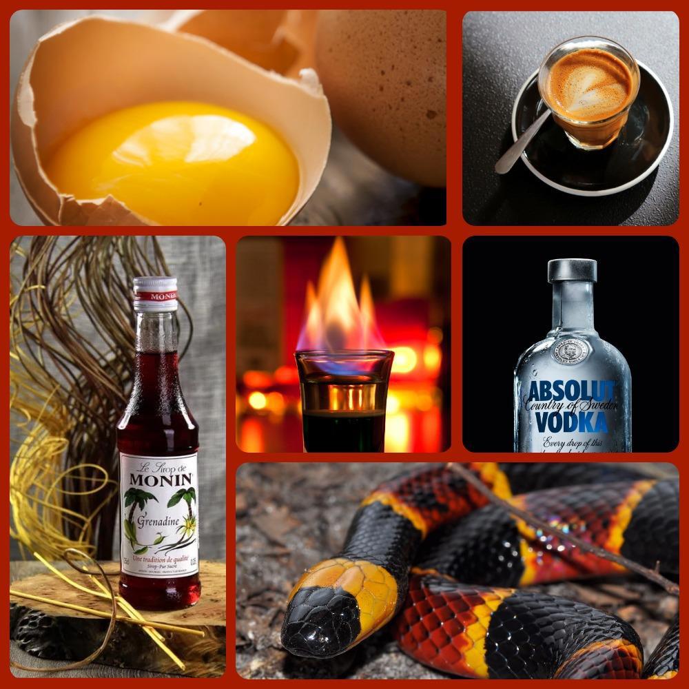 Состав: низ — сироп «гренадин» — 10 мл, середина — яичный желток — 1 шт, верх — кофе эспрессо — 20 мл, антресоли — водка (вообще теоретически водка горит, но лучше взять хороший самогон крепостью не менее 70%, чтобы уж точно загорелось) — 10 мл. Поджечь.