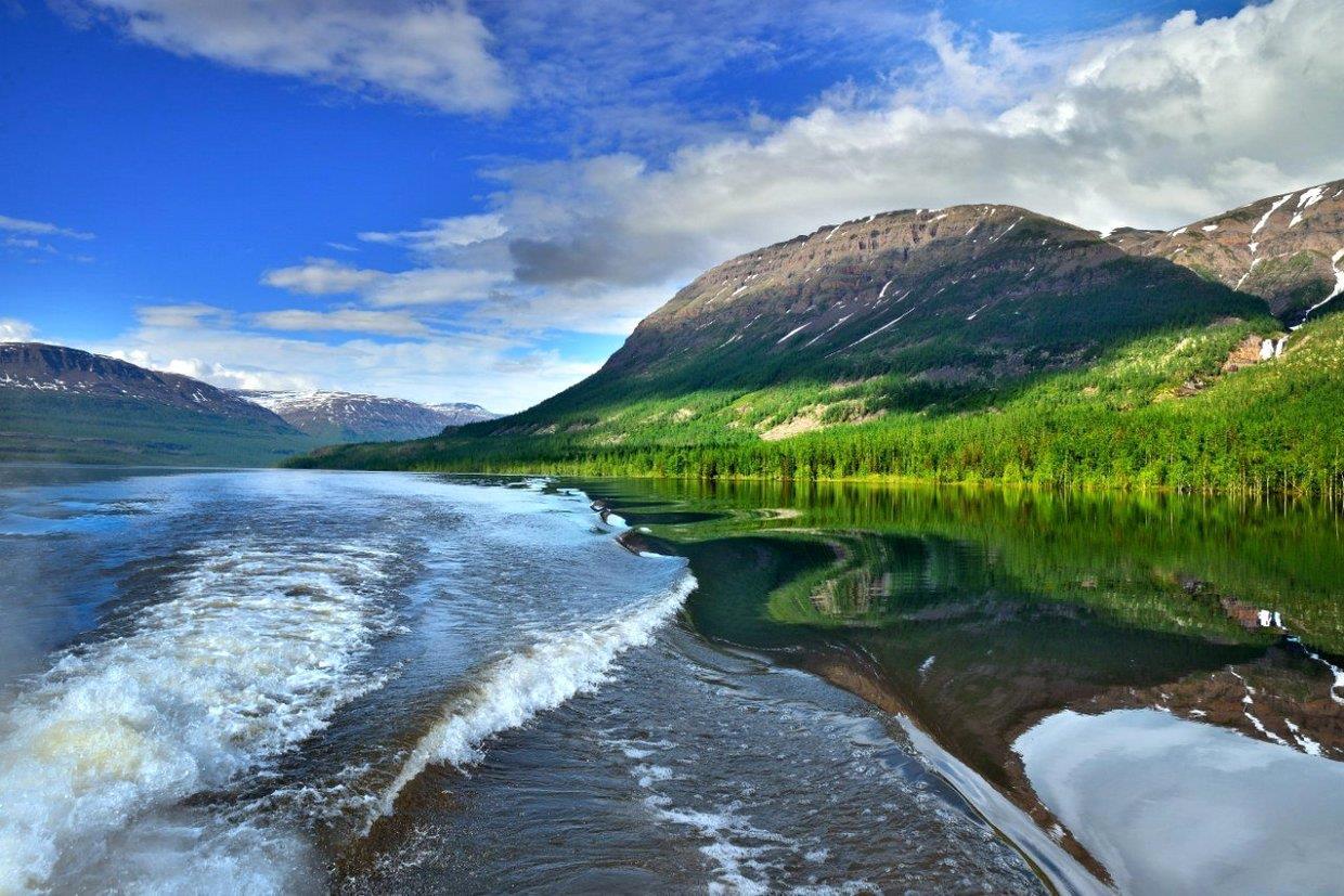 Между тем – края эти очень суровы. Тем больше впечатляют снимки вот такого типа, со следом на воде от моторной лодки: