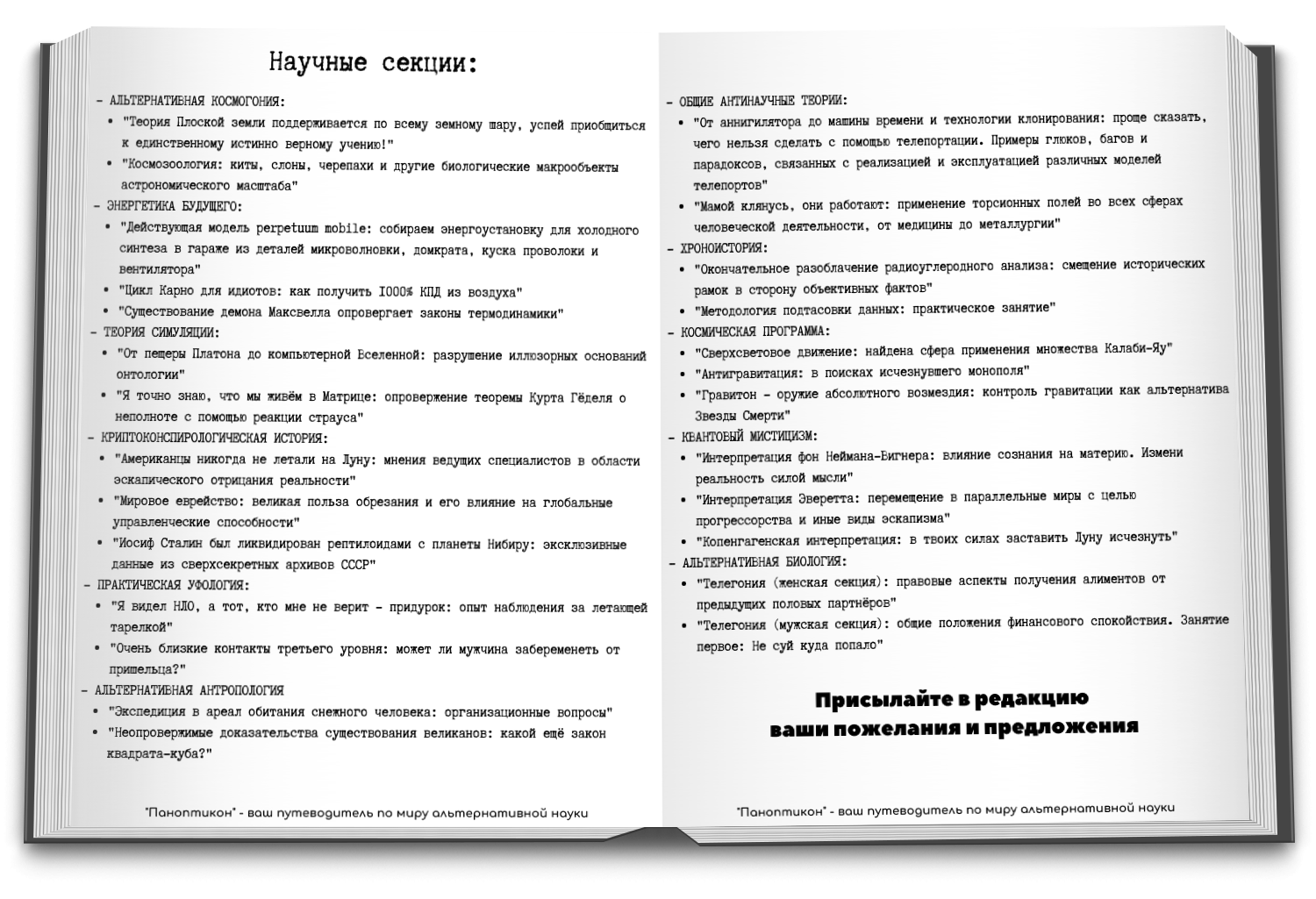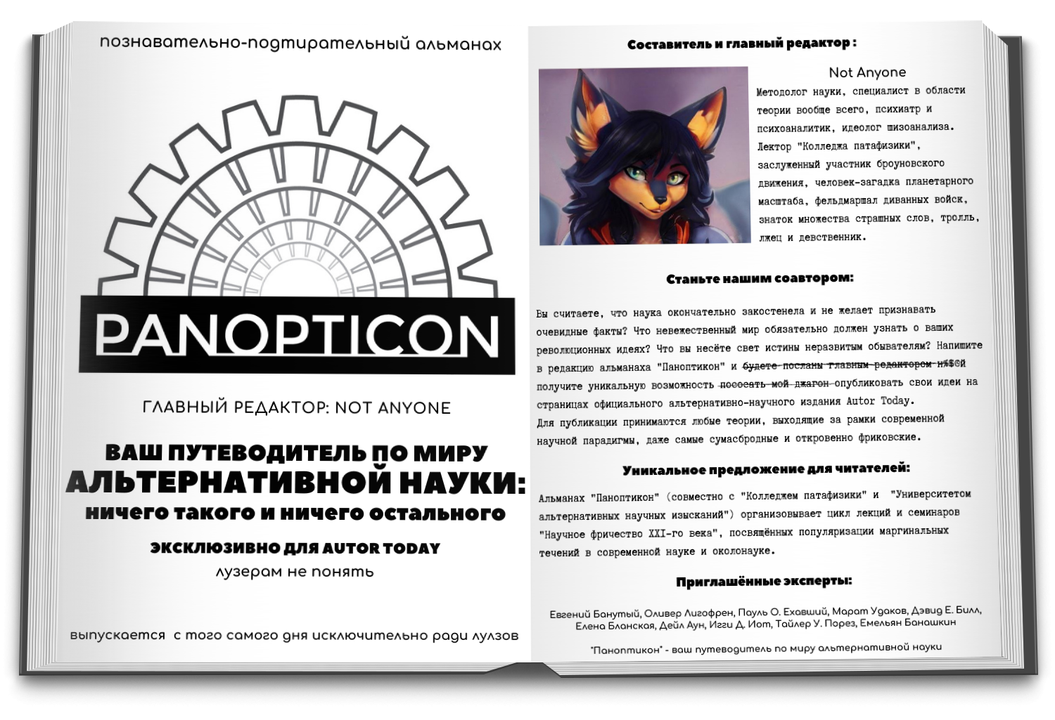 Автор: Сё ЭнВ эпоху великих перемен, когда остро встают вопросы о науке и лженауке, мы, сообщество Autor Today, должны быть на переднем краю прогрессивной мысли. Сегодня я представляю вашему вниманию новое периодическое (в идеале еженедельно, но не уточняю, ежесколькинедельное) печатное издание «Паноптикон», чуть более, чем полностью посвящённое альтернативной науке и разного рода маргинальным теориям.