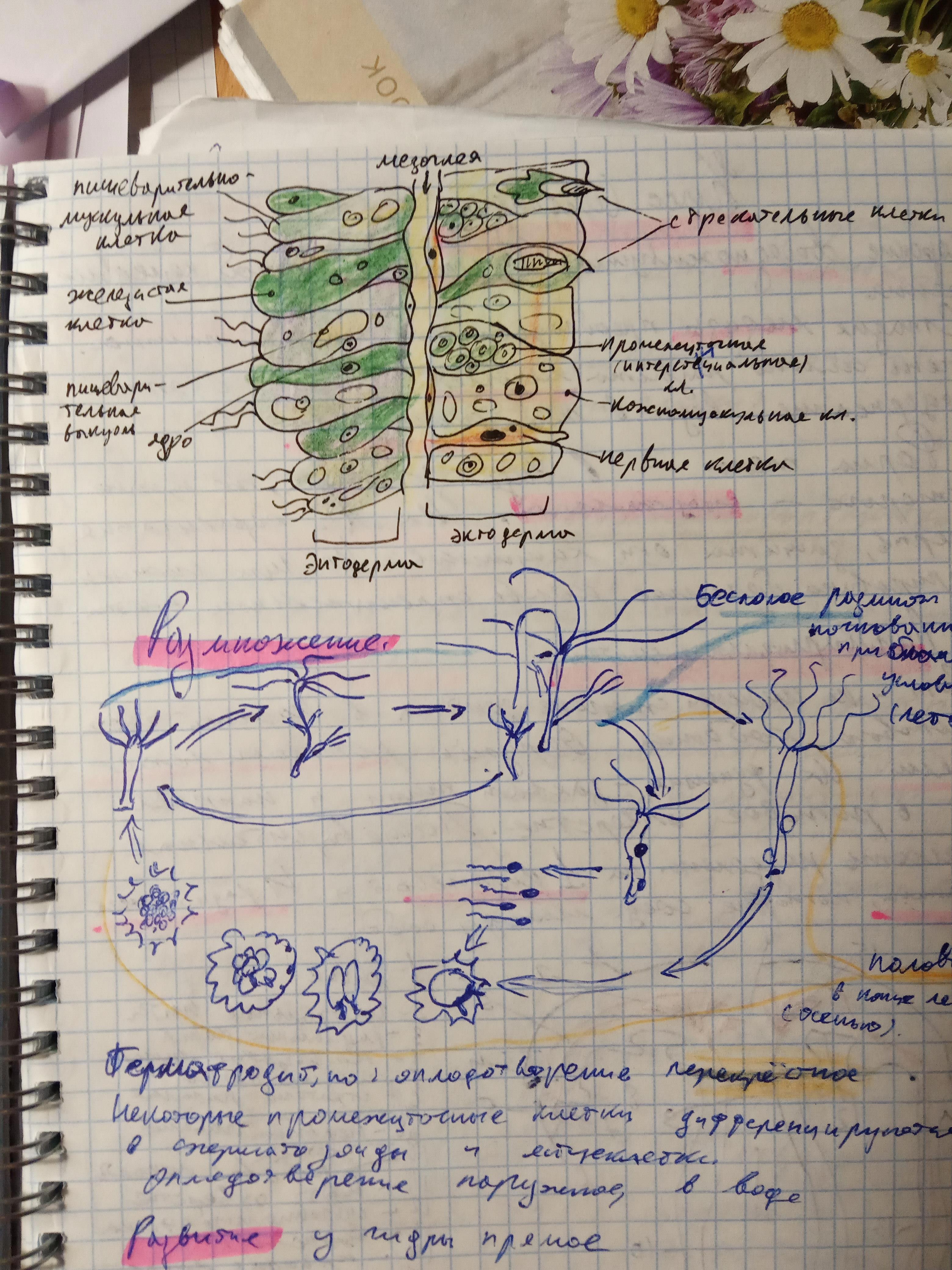 А вот это рисунок уже по делу: мы изучали кишечнополостных. Вообще самые классные и, главное, полезные рисунки у меня в тетради по ботанике и зоологии
