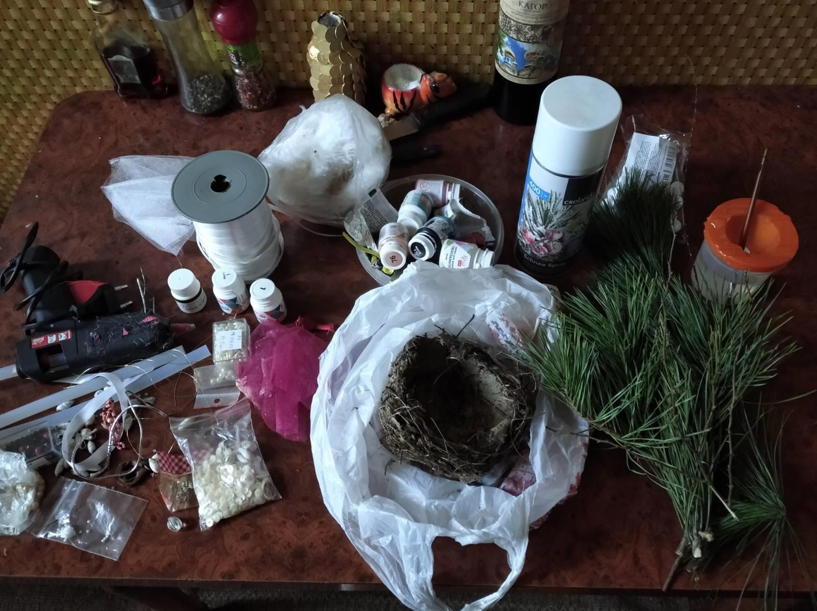 А помните, у меня был большой деревянный гриб? Я его выбросила, потому что нашла гнездо, и теперь деревянного гриба у меня нет, но гнездо есть. Сосновые веточки я нарезала возле спілки афганцев, они у себя сосенки посадили.