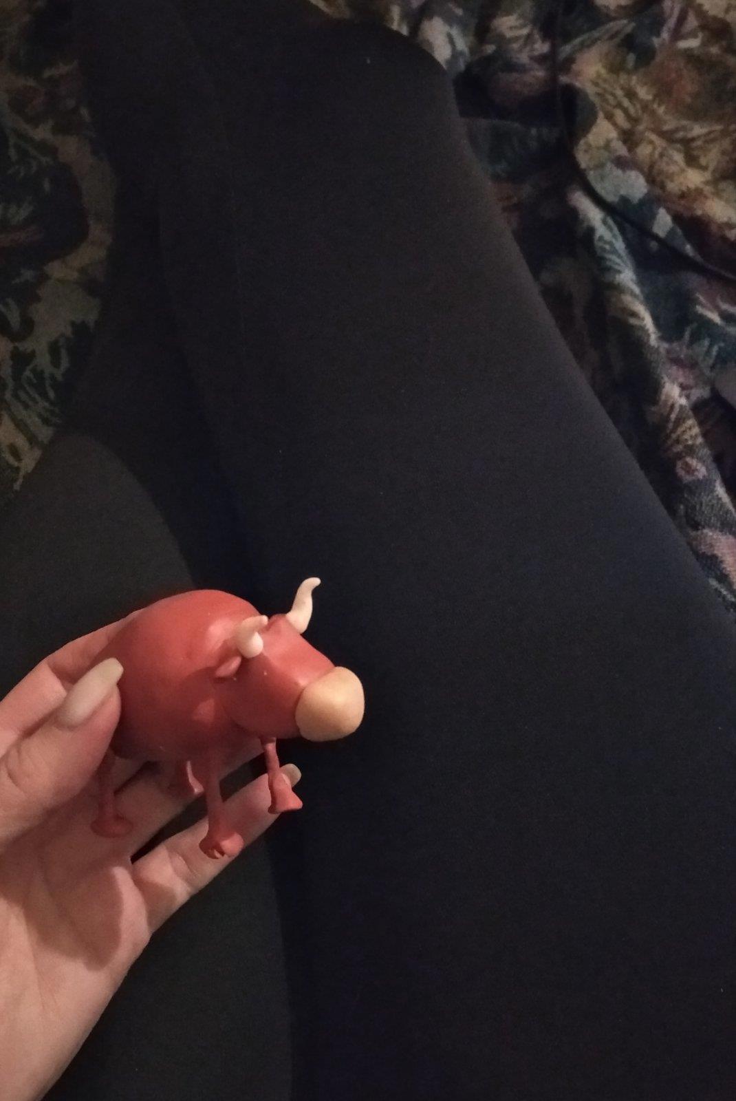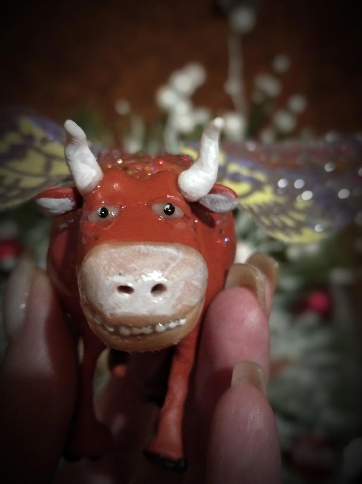 Основу можно сделать из фольги, это сэкономит пластик. В ножки вставить проволочки. Постепенно наращиваем бычка и запекаем в духовке совсем недолго. Ишь как улыбается, собака. Я приклеила ему крылышки из органзы, типа прилетел. На кого-то он мне смахивает.