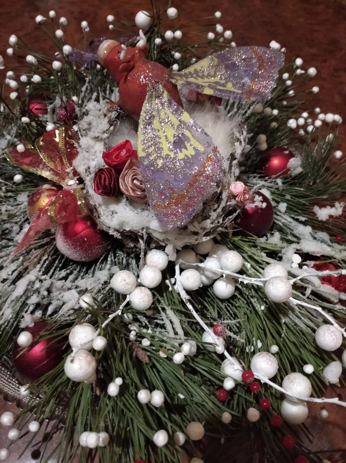 Жидким снегом покрывать лучше в финале сборки. Мой снег маде зи дойч, у меня там подружка замужем, так привозит всякую поебень, будто у меня своей мало. Но этот немецкий снег, девчонки, в сто раз лучше чем наш. Выглядит естественнее и держится хорошо. Можно добавить ещё немного красного, к примеру, утыкать тонкий прутик красными бусами и собрать из бусинок тычинки. Верхнюю я посадила на клей для декупажа, но можно и на горячий клей.