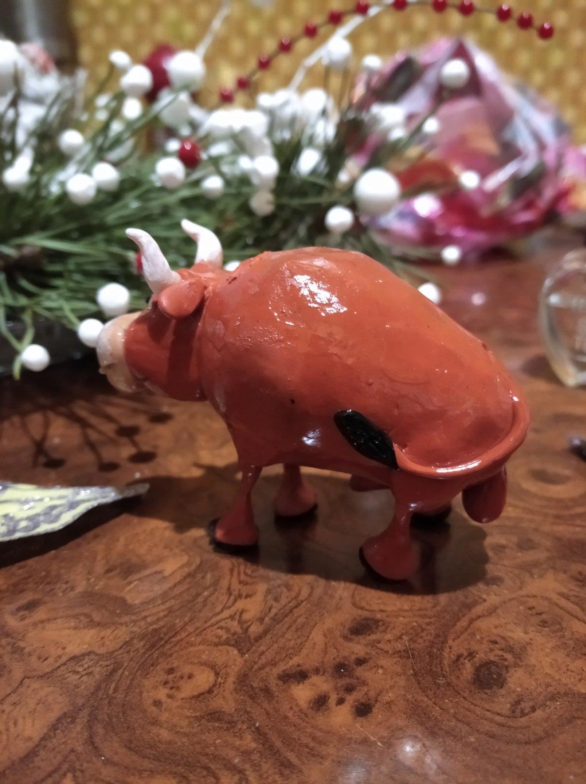 Итак, теперь у нас имеется похожая на мусорную кучу композиция, центральное место в которой отводится гнезду. А раз есть гнездо, в нём кто-то должен сидеть. Вы можете возразить, что зимой в гнезде никому сидеть не положено, все улетели нахрен, но, блин, оно же есть? Сюда просился снегирь, но когда я снова открыла свой мешочек для трудов (прости г_ди), оказалось, что полимерная глина закончилась, остался только комок терракотовой. Печаль-беда-огорчение. Ну, давайте сделаем быка, что ли. Всё-таки скоро год быка, да? Он, правда, белым должен быть, но у меня нет белой полимерки.