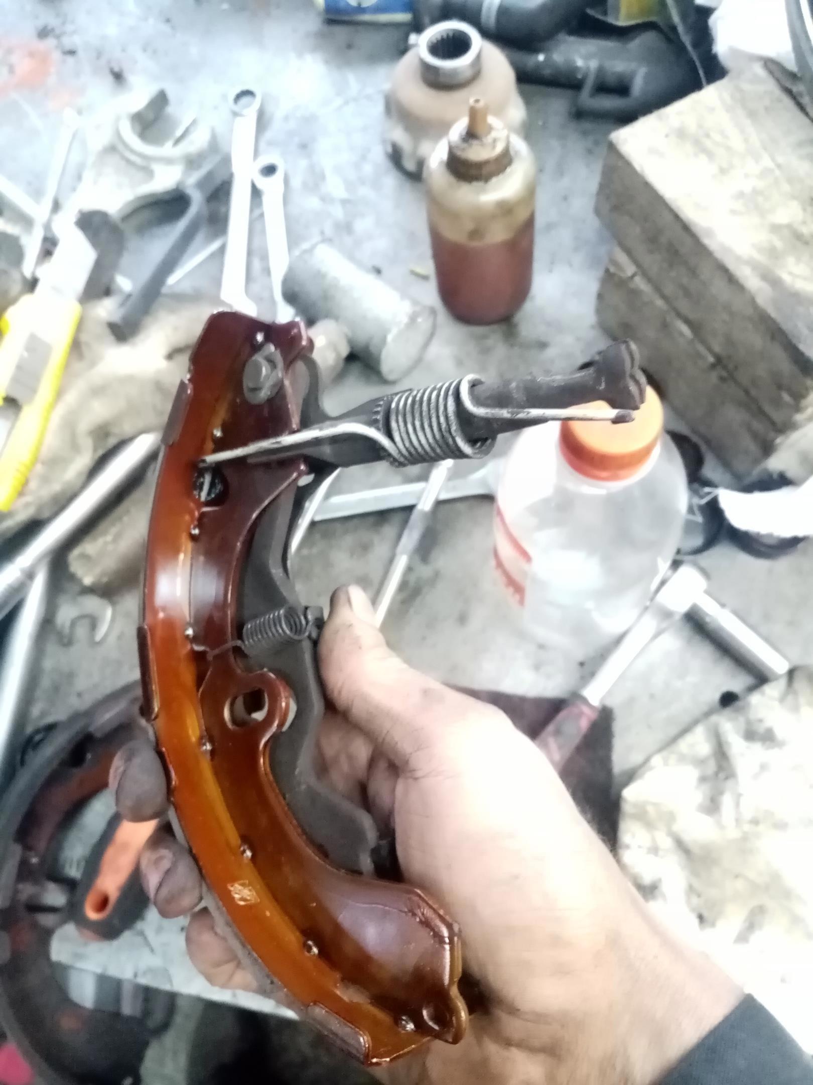 А вот с задними колодками приключилась подстава мирового уровня. Вообще у машины педаль тормоза проваливалась, я ещё думал - к чему бы это? Открыв задний правый барабан увидел что он не разведен, тоесть жидкости не хватает чтоб колодки уперлись в барабан сразу, и надо нажать 2 раза чтоб на педали появилась реакция. "Где-то я уже такое видел", подумал я. Справа колодки изношены, одна отгрызена, и накладка болтается. Тут ещё ступица в блоке с барабаном, как на Форде Фиесте. С одной стороны - удобно. Места для замены барабанных колодок просто вагон - всё легко, просто и