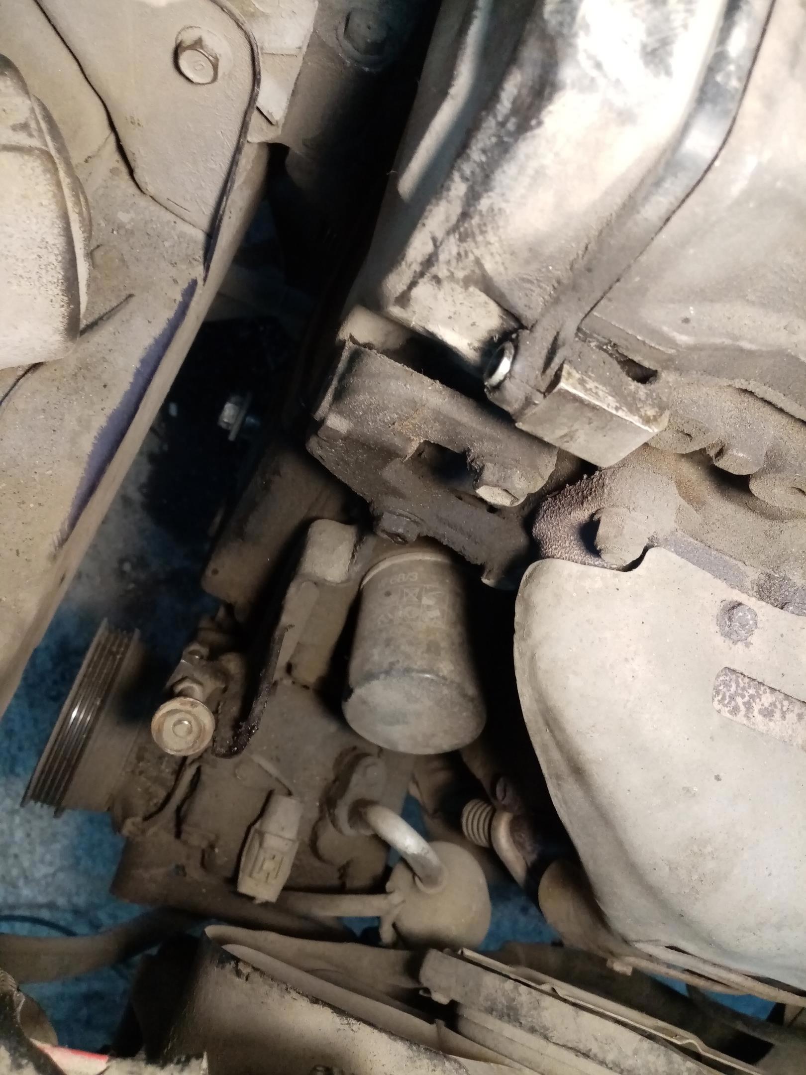 Масляный фильтр тоже не так-то прост, прячется между насосами гура и кондиционера. Вот он, хитрюга:
