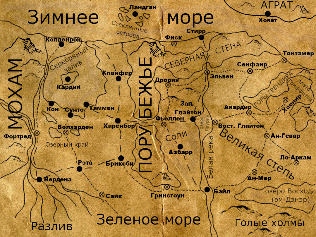 Автор: Александр ШиховЦикл получил свою официальную карту. Так же в иллюстрациях и доп. материалах - для удобства. Думаю, где тракты и города "живые", а где заброшенные - визуально легко разобраться.