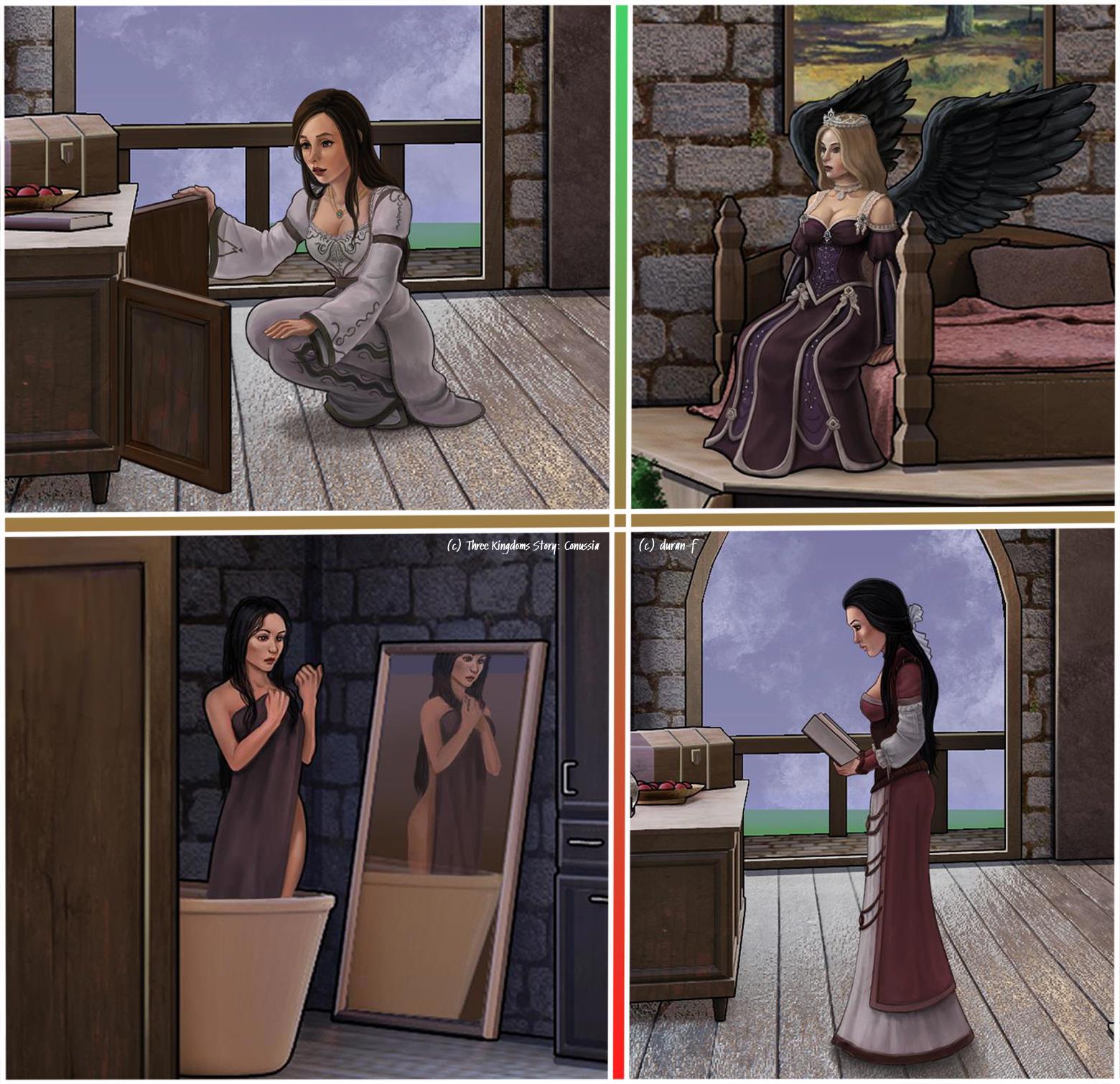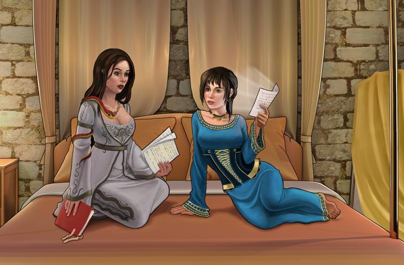 (на работе ниже я рисовала лишь девушек и ткань на зеркале, фон от 3D-художника новеллы, для которой сделан арт)