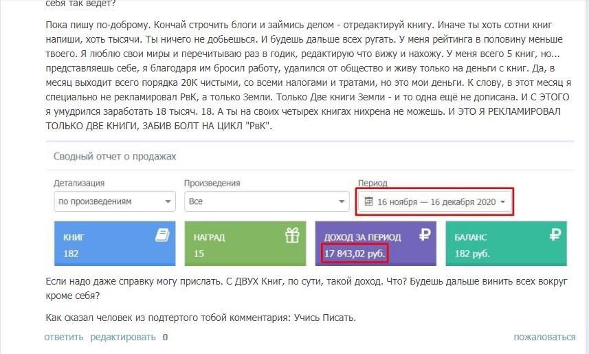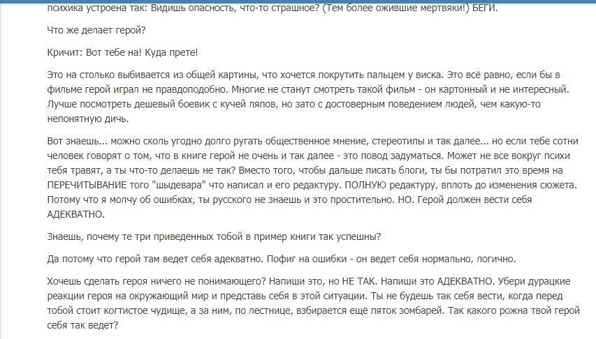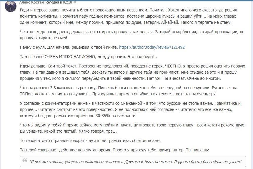 Нет, ну я ЧЕСТНО хотел ему объяснить, что дело не в людях, не в читателях, не в топах, а в том, что он пишет нелогичный бред, о чем, кстати, ему даже написали в рецензии: https://author.today/review/121492