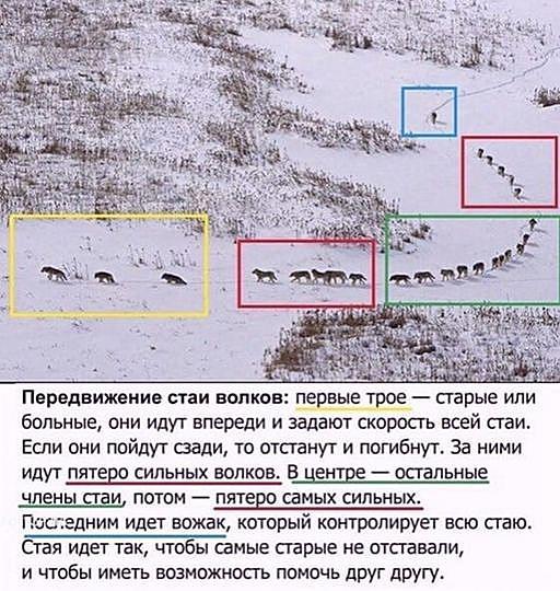 Что-то, глядя на фотку, не верится в данное описание. Слабые и больные прокладывают тропу по глубокому снегу, а вожак идет последним? Ага, верю) То есть слабые и больные скоро выдохнуться и остановятся. При угрозе спереди вожаку надо будет еще добежать, если вдруг на медведя, к примеру наткнутся. Все это выглядит крайне нелепо, даже с точки зрения человека, не говоря уж о лесных хищниках. Откуда слабые и больные знают куда идти, им вожак по рации передает?