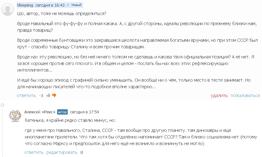 Но нет, он не читатель! Когда я заглянул в профиль этого Sleeping, оказалось он себя позиционирует как писатель! (Вот кстати у него есть про СССР в будущем. Но при чём тут я???) И там люди ему пишут в гостевой, мол, как приятно читать такие разумные рассуждения. Причём хорошим русским языком пишут. А он им таким же грамотным языком отвечает. Ну просто загадка даже, как же человек в других местах разумен и рассудителен - а тут вдруг такое понаписал, что никакого отношения к критикуемому тексту не имеет?