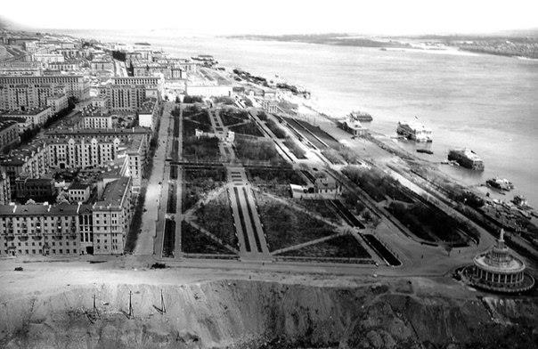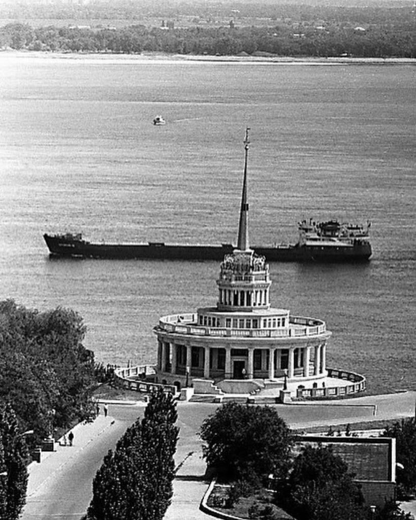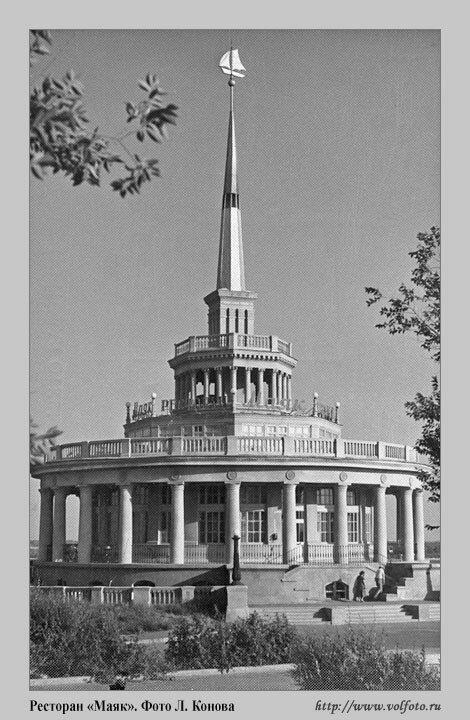 В 1955 году был реализован наконец проект уже хорошо известного моим постоянным читателям Ефима Левитана первого в восстанавливаемом Городе отдельно стоящего (не при гостинице) ресторана, который получил название "Маяк". Подходило ли это название этому зданию, находящемуся именно в этом месте - у слияния Царицы и Волги? Судите сами: