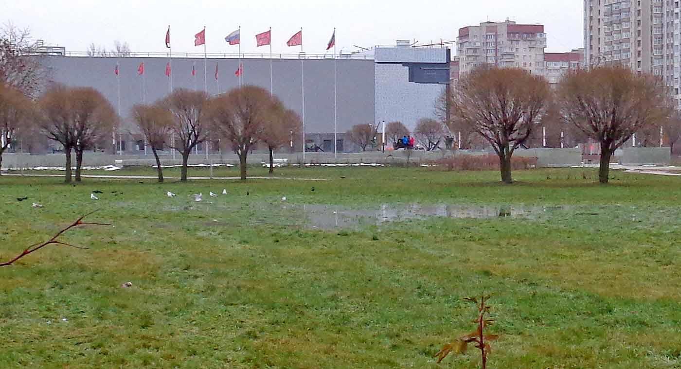 Вид на Егоровский сквер, на пересечении пр. Ветеранов и ул. Добровольцев. Большое серое - это ледовая арена у фитнес-хауса. Лужа и чайки, они там промышляют какой-то отмёрзшей живностью. (Как мне сказали на вк "Чайки промышляют отморозками").