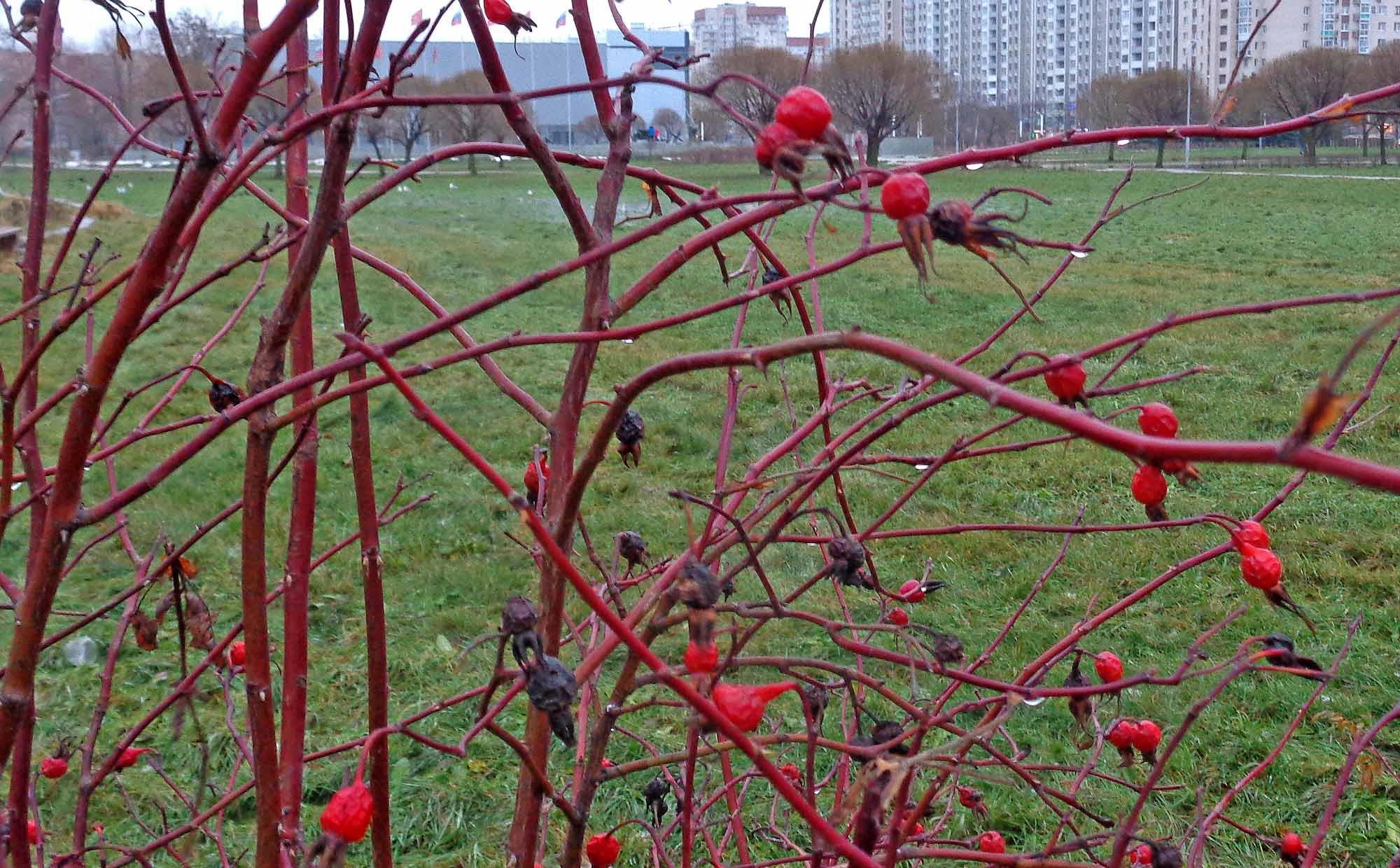 Веточка шиповника, капельки, ягодки. Егоровский сквер: