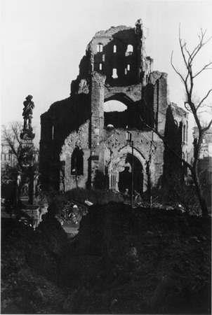 В годы второй мировой войны во время 262 бомбардировок Кёльна британской авиацией, Большой Святой Мартин был практически разрушен. В ночь с 30 на 31 мая 1942 года были полностью разрушены крыши нефа и башня церкви, но уже в начале 1943 года крыша была восстановлена. Во время самой сильной бомбардировки Кёльна 29 июня 1943 года, когда погибли 4377 человек, а также во время ожесточённых октябрьских бомбардировок Большой Святой Мартин практически не пострадал. Однако, во время авианалёта 6 января 1945 года стены нефа и средокрестия были разрушены прямым бомбовым попаданием. Из четырёх башенок сохранилась только одна – северо-восточная. Последний большой воздушный налет 2 марта 1945 причинял самые значительные убытки. Когда через 4 дня в Кёльн вошли американские войска, то над разрушенным на 95% городом возвышались только руины башни Большого Святого Мартина. — цитата из Википедии